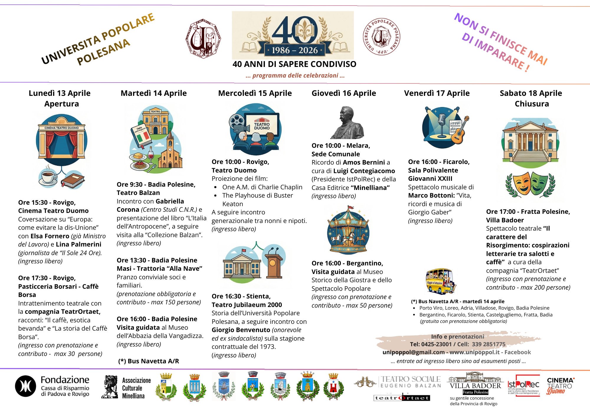 L’Università Popolare Polesana festeggia un traguardo straordinario: 40 anni di attività (1986–2026) al servizio della cultura e della comunità. Vi invitiamo a una settimana speciale ricca di incontri, teatro, musica e convivialità in tutto il territorio polesano.